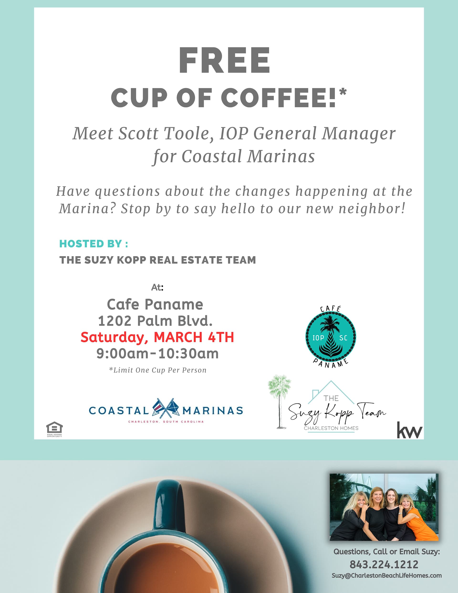 We've invited the community to join us for a Free Cup of Coffee and to meet the new General Manager of the Isle of Palms Marina.